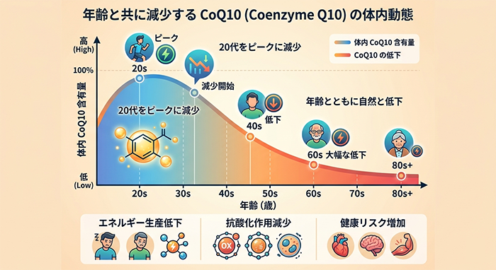 CoQ10(ユビキノン)は年齢とともに減少します。