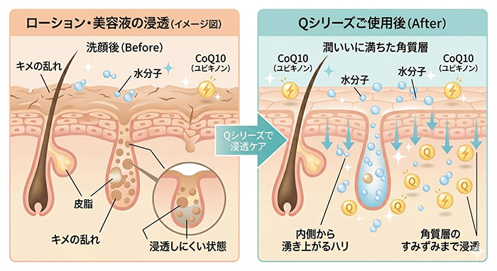 角質層のすみずみまで、化粧水や美容液を浸透させます。